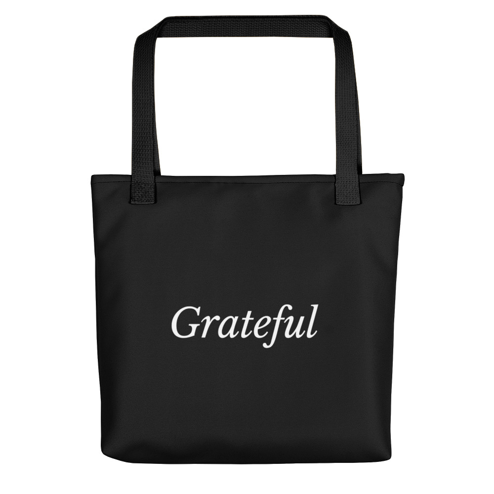 This black ‘Grateful’ print design tote bag is spacious and trendy to help you carry around everything that matters.