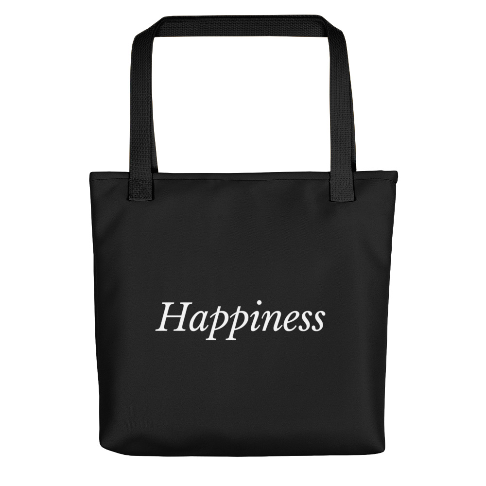The black ‘Happiness’ print design tote bag is spacious and trendy to help you carry around everything that matters.