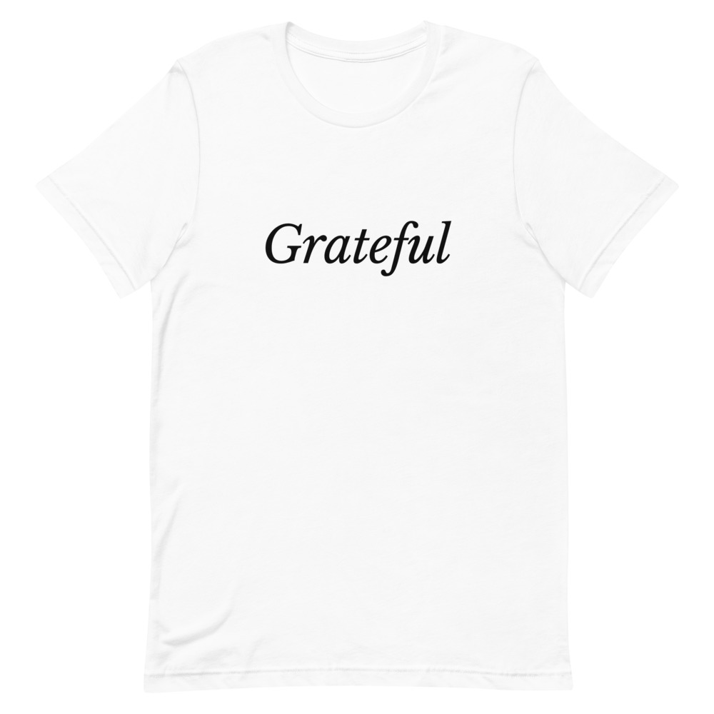 This unisex white ‘Grateful’ print t-shirt is a true winner as a personal purchase or gift. It feels soft and lightweight, with the right amount of stretch. It’s comfortable and flattering for both men and women.